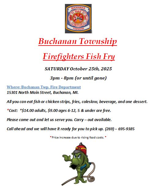 Buchanan Township Fire Department Fish Fry Saturday October 25th, 2025 3 PM to 8 PM Buchanan Township Fire Department 15301 Main Street Buchanan, Michigan 49107 Click on Logo For More Details |